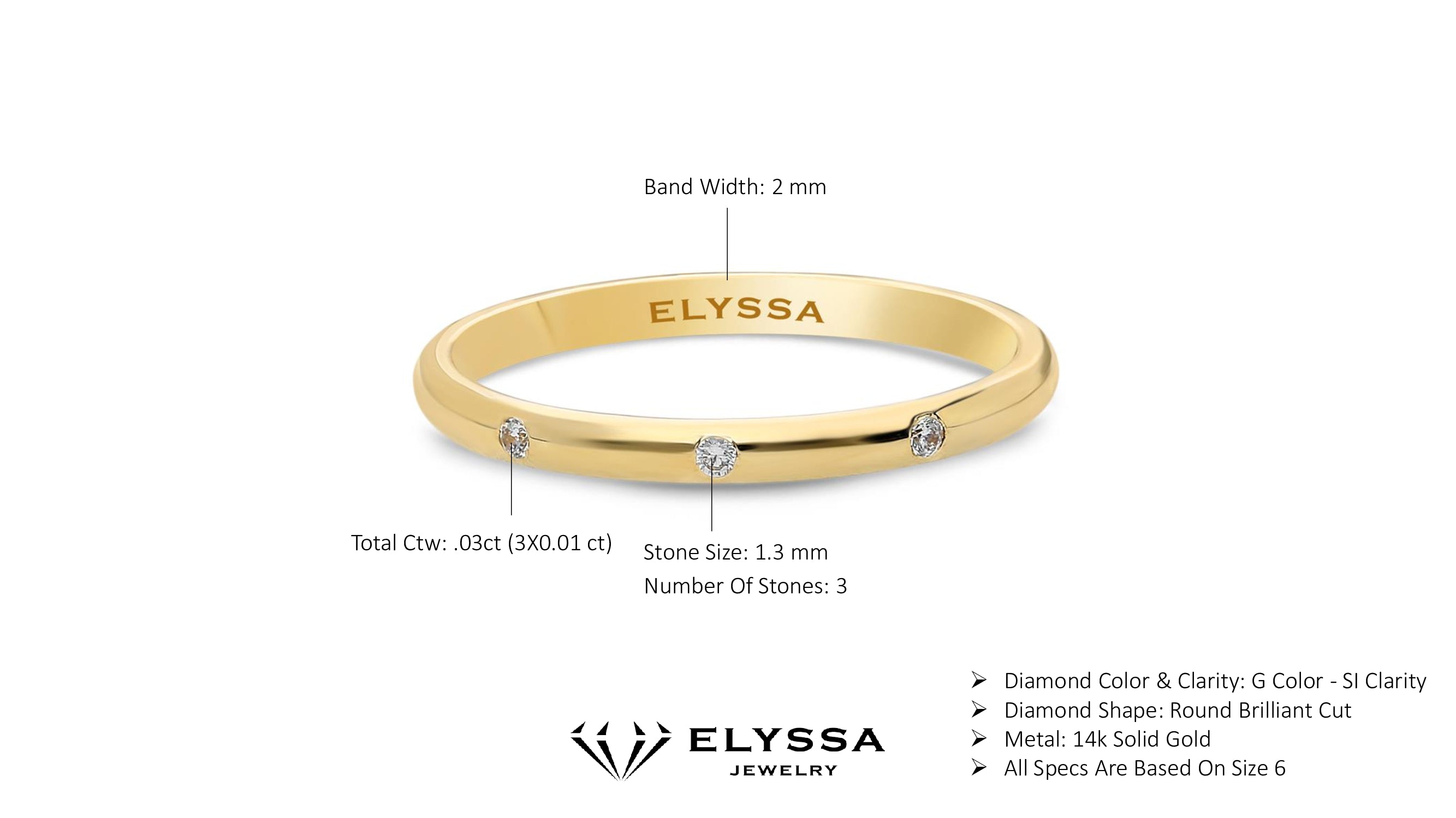 | 14K Gold 2mm Three Stone Burnish Set Diamond Wedding Band Stone(s) Info | |