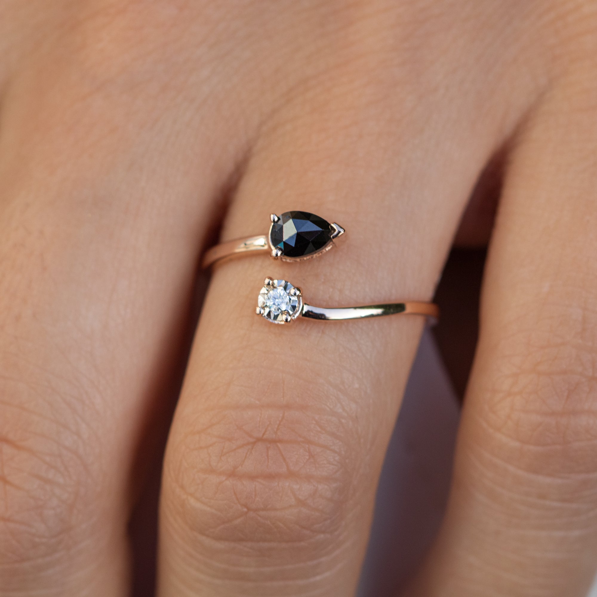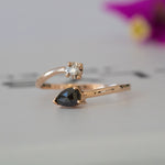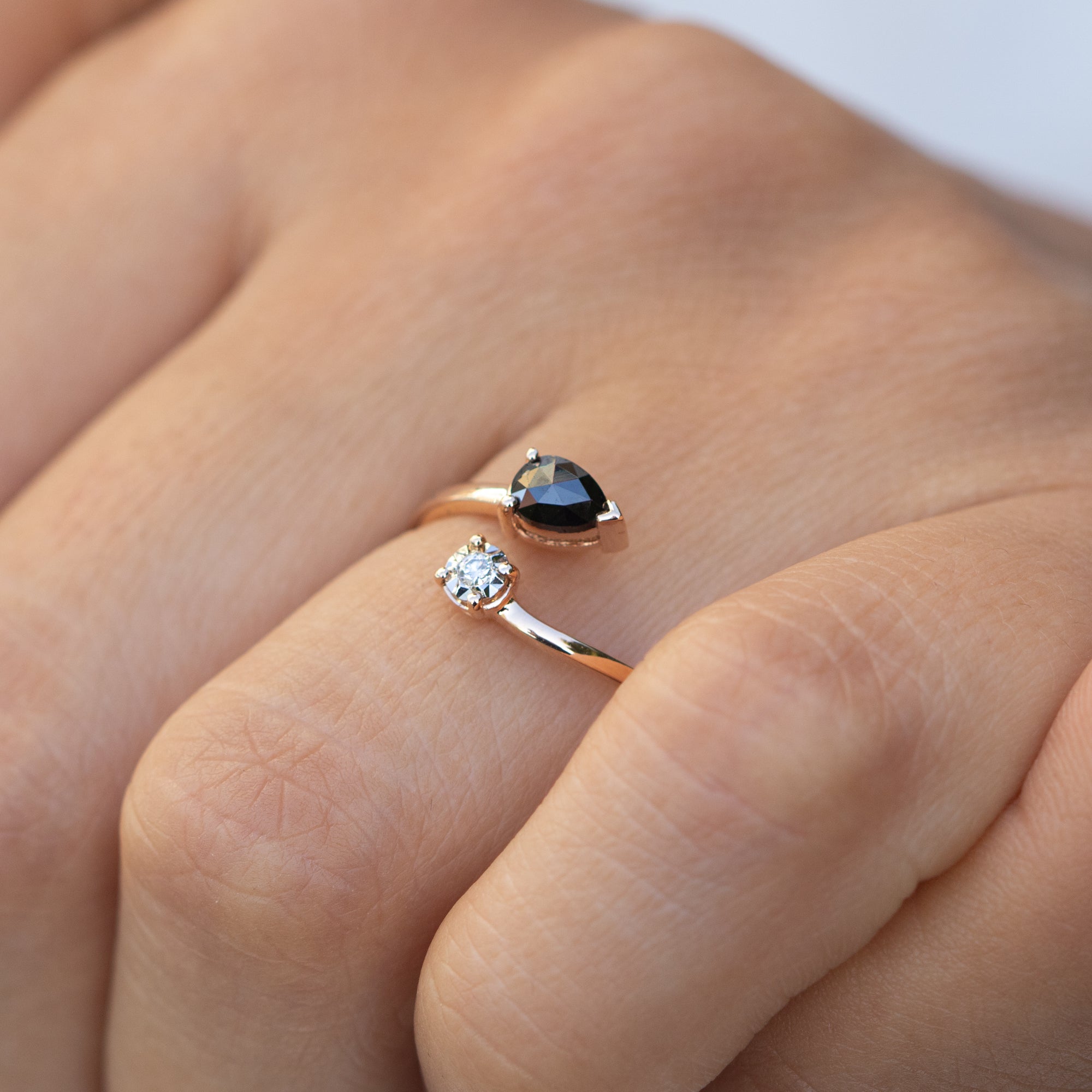 14K Gold Pear Black Diamond and Round Diamond Ring