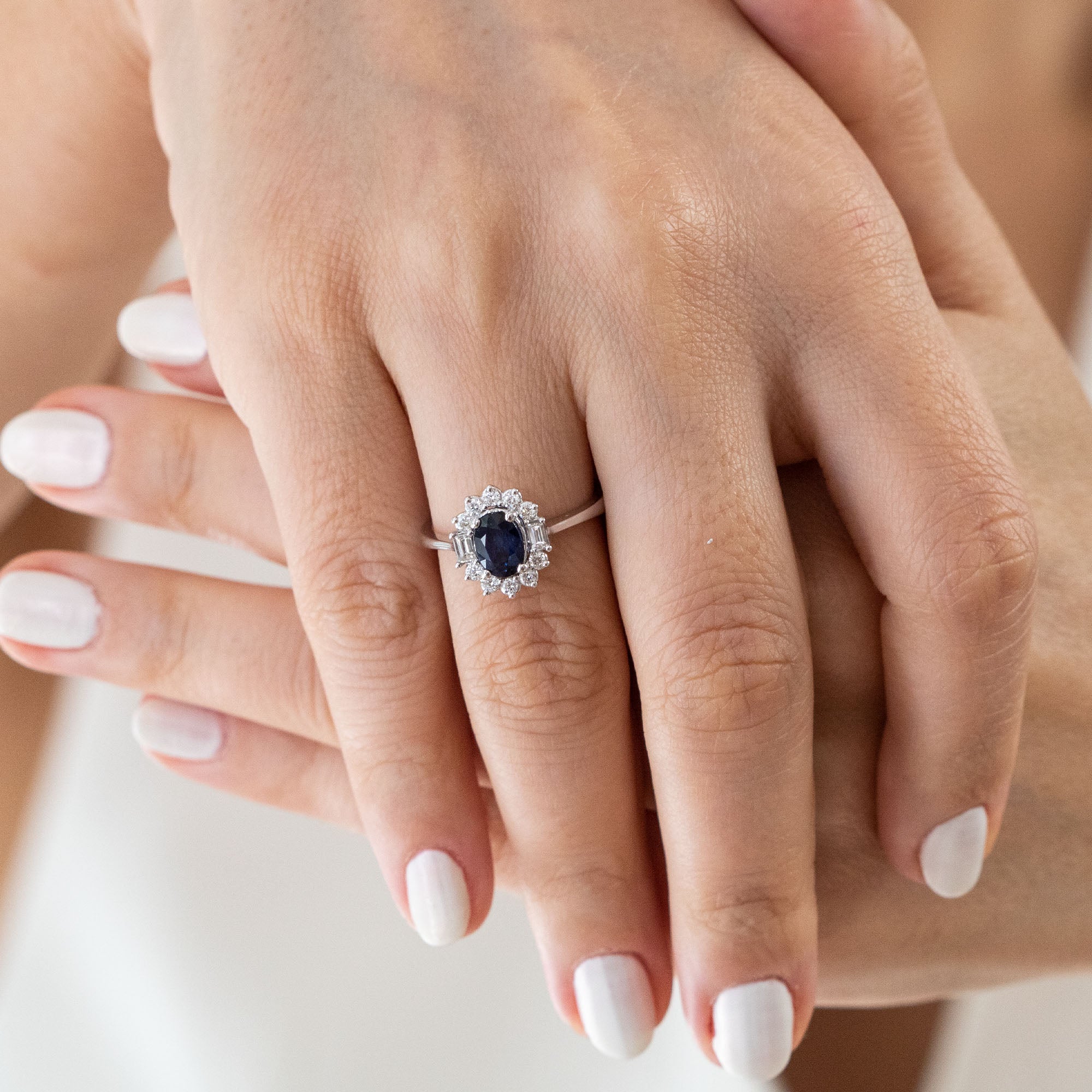 18K White Gold Baguette and Oval Cut Sapphire Engagement Ring